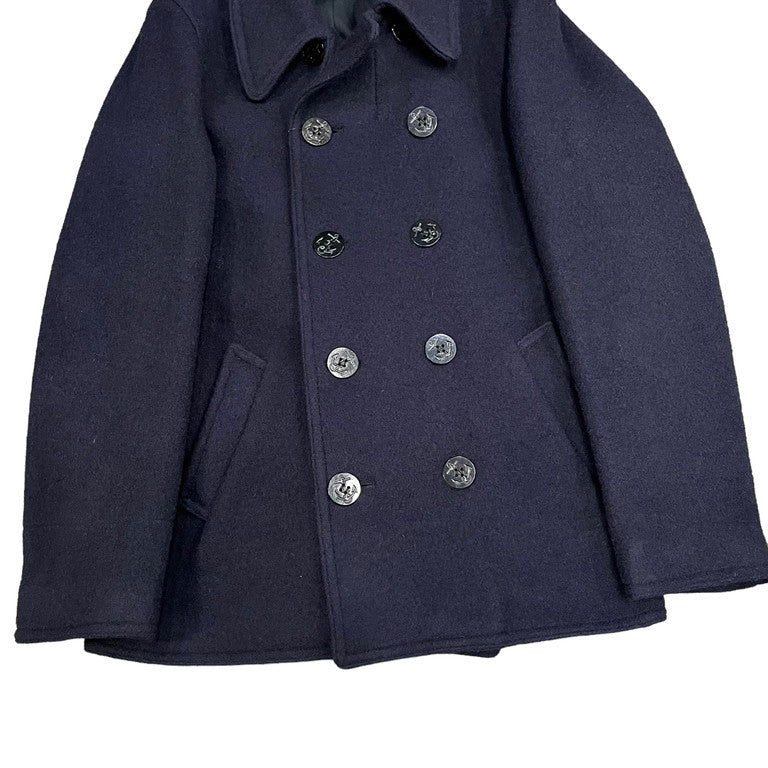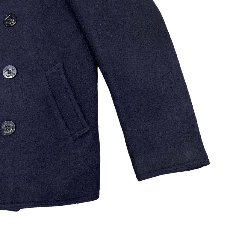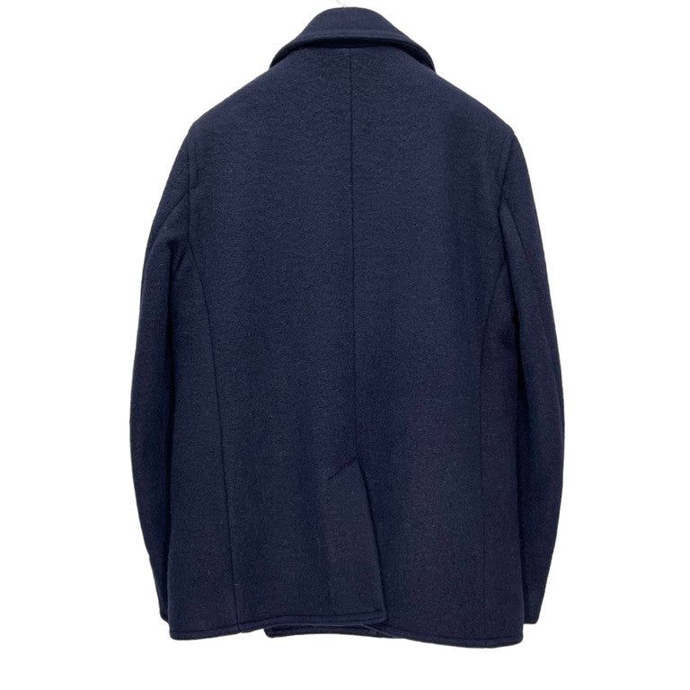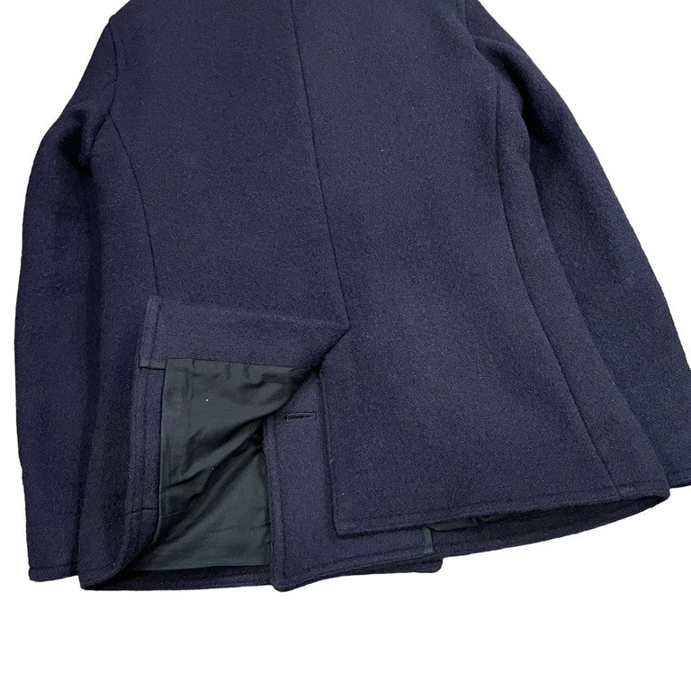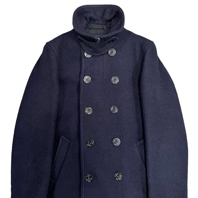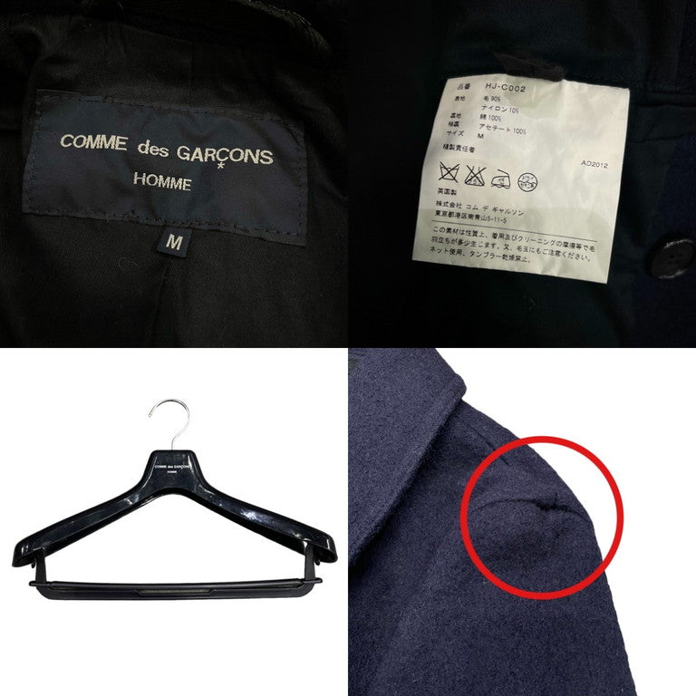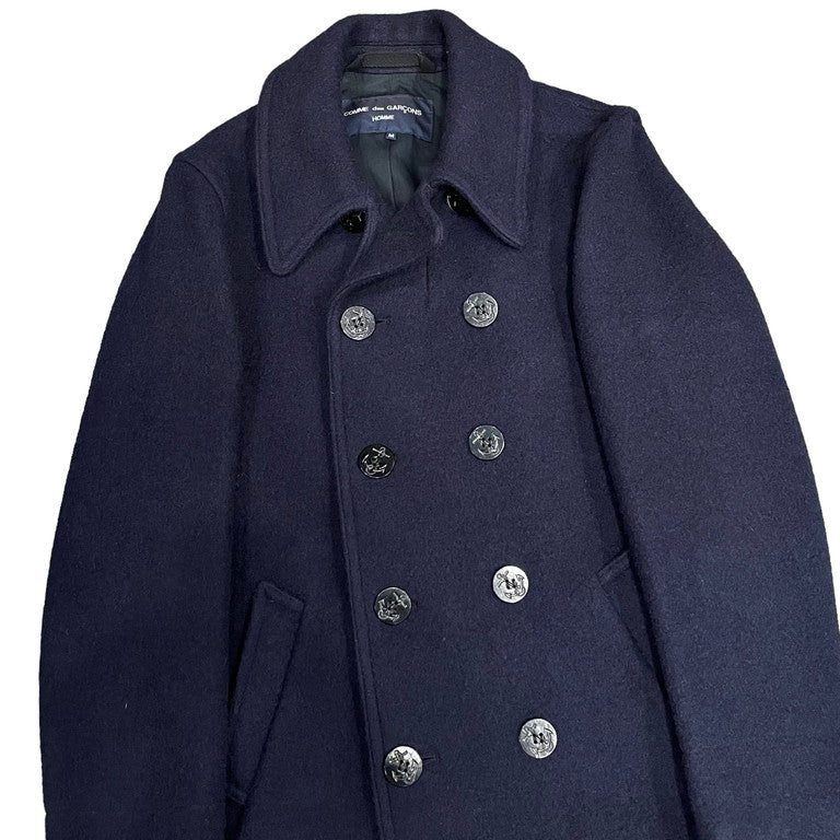 COMME des GARCONS HOMME × Gloverall 12AW ウールメルトンピーコートです。コムデギャルソンオムとグローバーオールのコラボレーションモデル。リーファーコートとも呼ばれるこちらの一着は、前合わせが右前でも左前でもお使いいただけるデザインです。イカリマークの入った大振りなボタン、首元のチンストラップ等トラディショナルなPコートのデザイン。ボディのライニングにはコットン素材が使用され、袖裏地のみアセテート生地を使用し袖通りが良くなっています。カラーリングは黒に近い濃紺です。左肩の袖山に目立ちづらい縫製の解れがございますが、それ以外は目立った傷や汚れもなくまだまだお使いいただけます。純正ハンガーが付属致します。