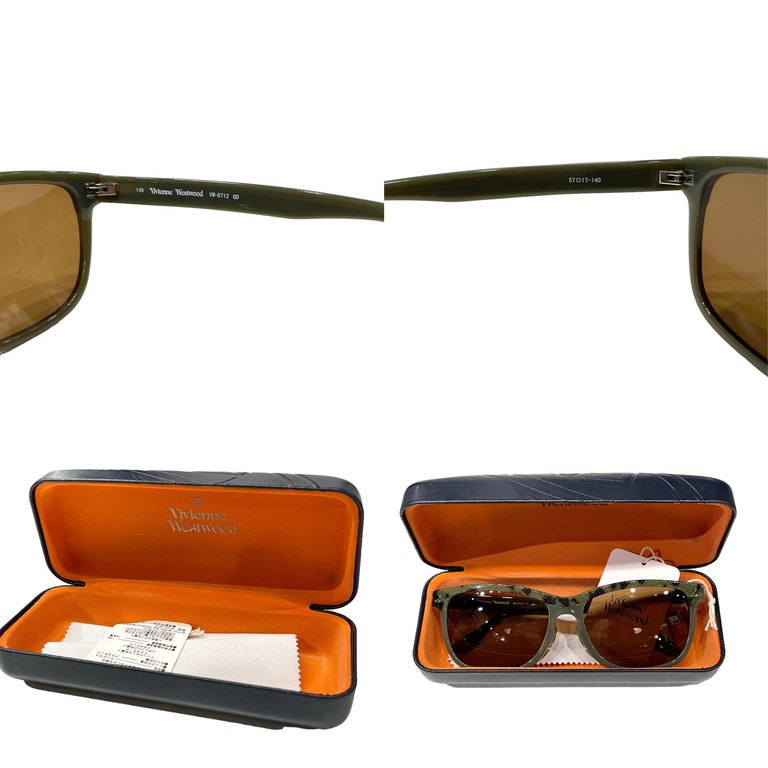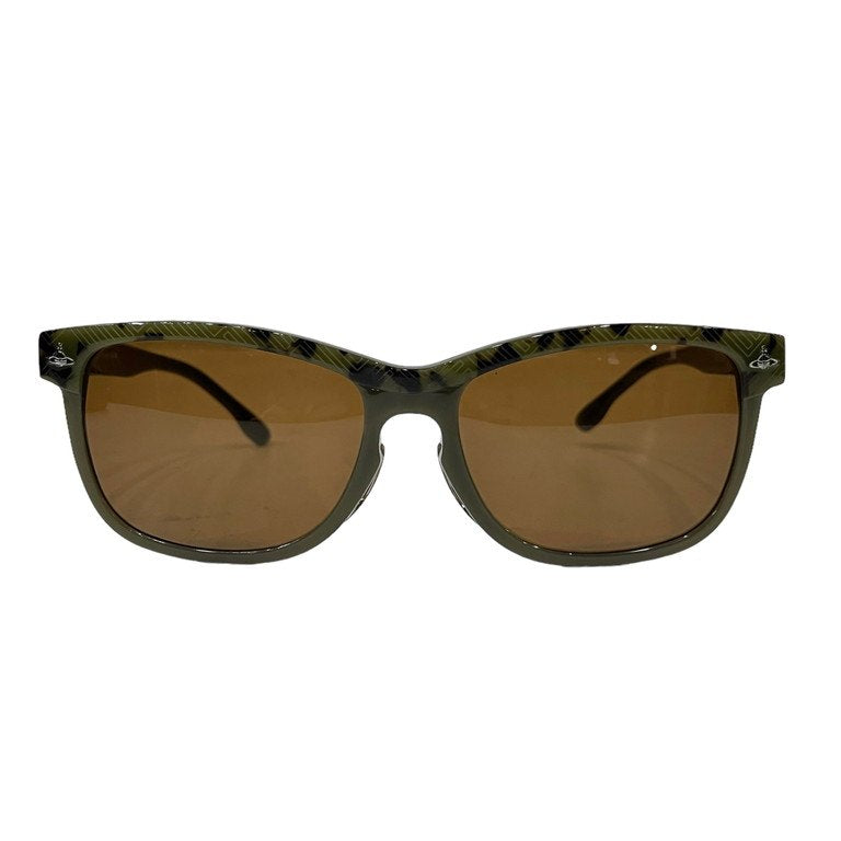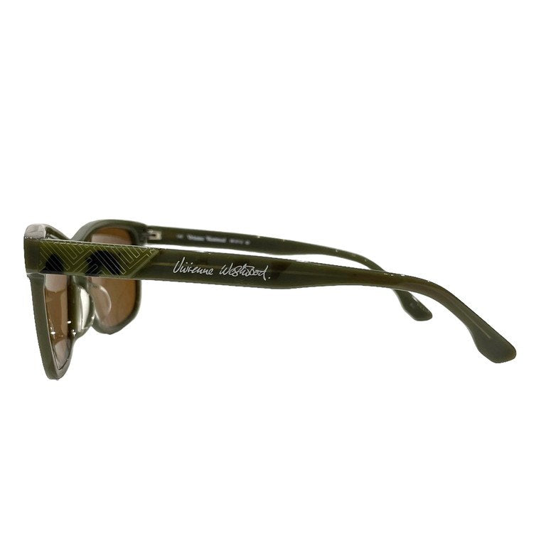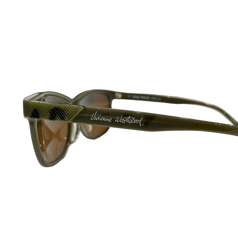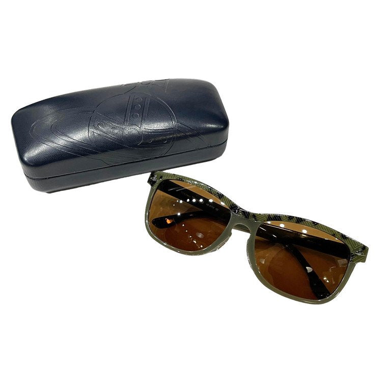 Vivienne Westwood セルフレームウェリントンサングラスです。セルフレームが使用されたサングラス。フレームフロントの縁にはアイコニックなオーブを、テンプルサイドにはロゴがあしらわれています。カラーはカーキ、べっ甲柄の模様があしらわれています。若干の使用感はあるかと思いますが、目立った傷や汚れもなくまだまだお使いいただけます。純正ケース・クロス・タグが付属致します。