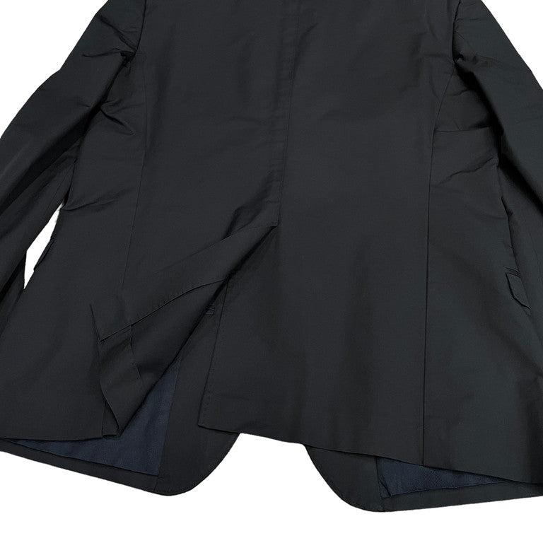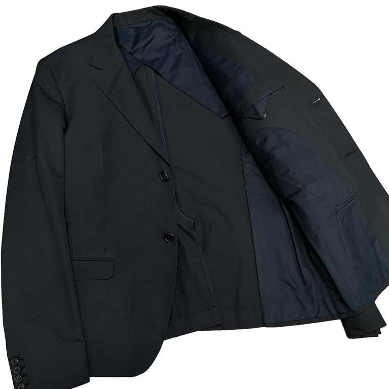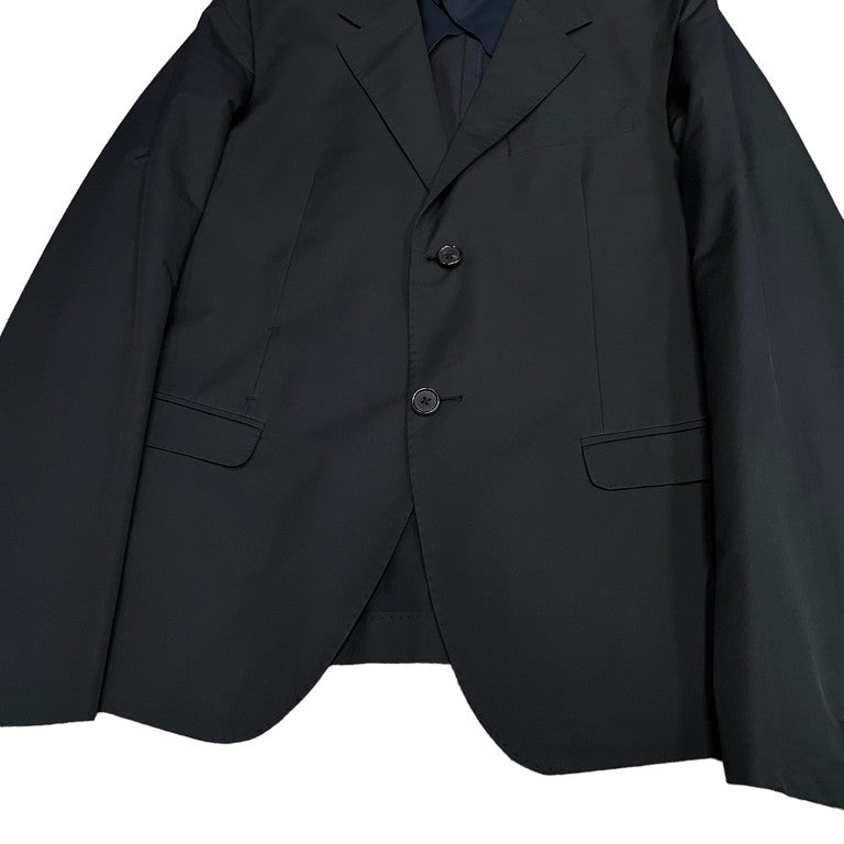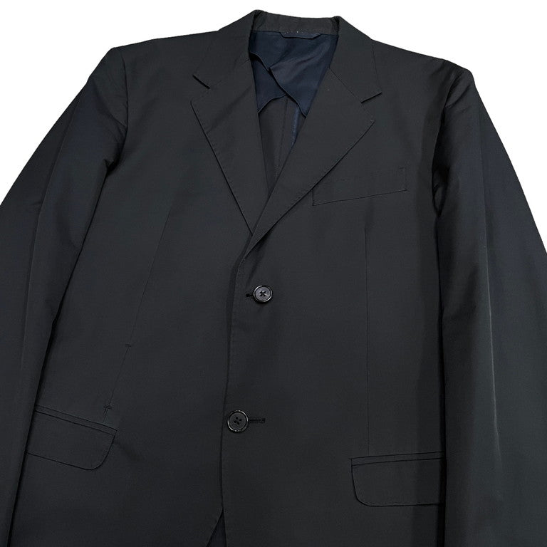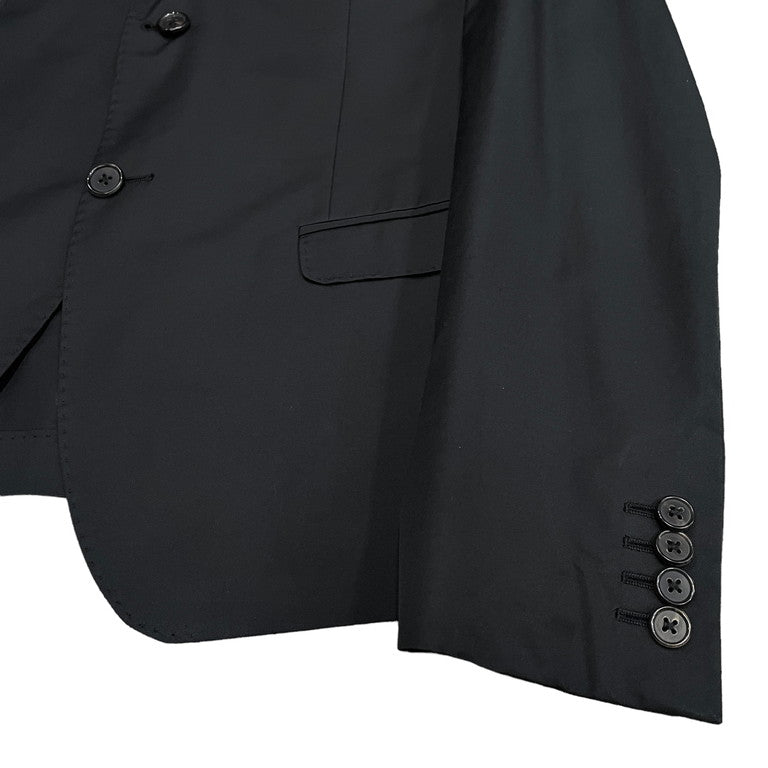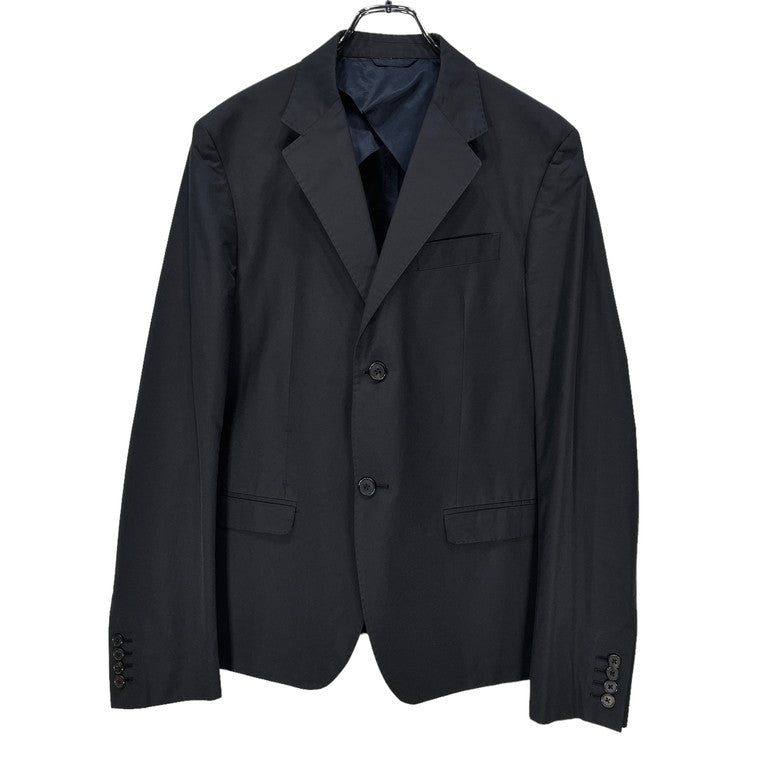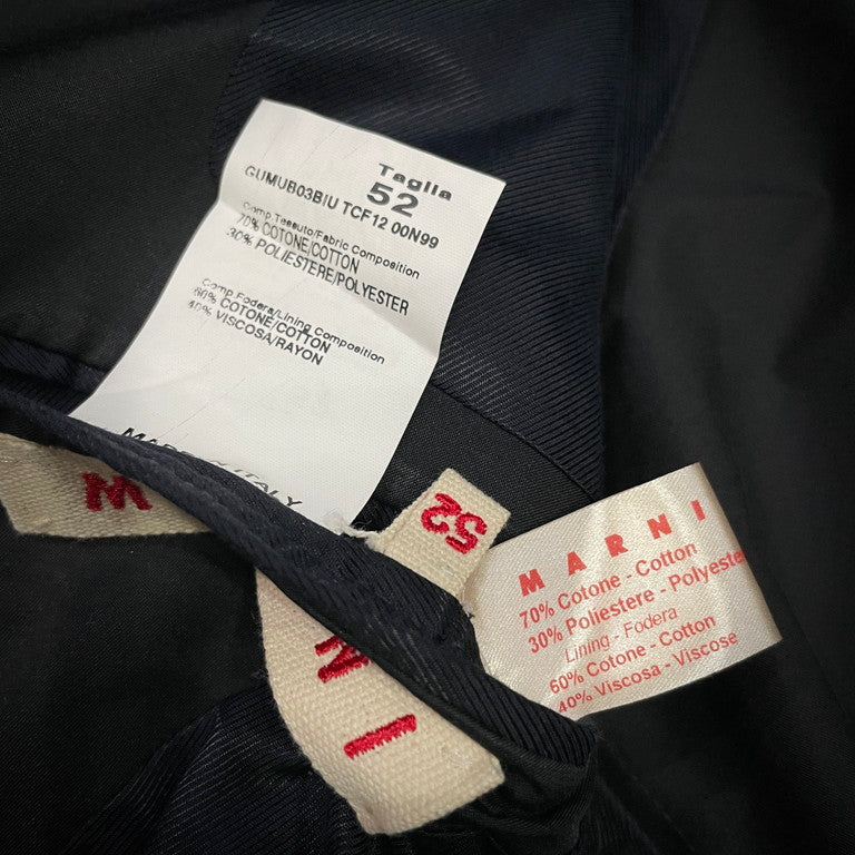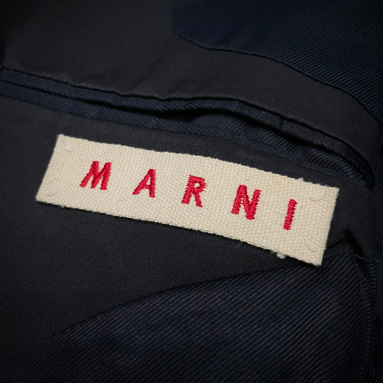 MARNI 2000s コットンポリエステルショート丈2Bナローテーラードジャケットです。光沢感のあるコットンポリエステル混紡スーツ生地を使用したこちらのアイテム。2B、ノッチドラペル、袖本切羽、センターベント、背抜き仕立てとなった春夏仕様の1着。イタリア製とのこともあり、ラペルやライニングの縫い付けはハンドステッチにて形成されております。Size 52 にしては肩幅44cmと細身でショート丈で仕立てられていることから、断定的ではありませんが、2000年代中期から後期に展ぜ開されたものかと思われます。細身かつ若干ボックスシルエットで着用しやすい1着。若干の使用感はあるかと思いますが、目立った傷や汚れもなくまだまだお使いいただけます。