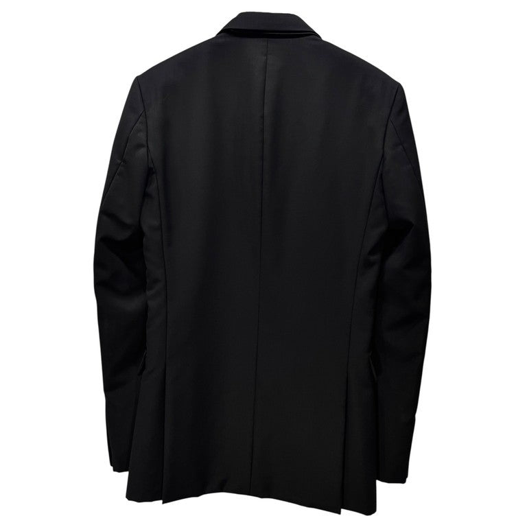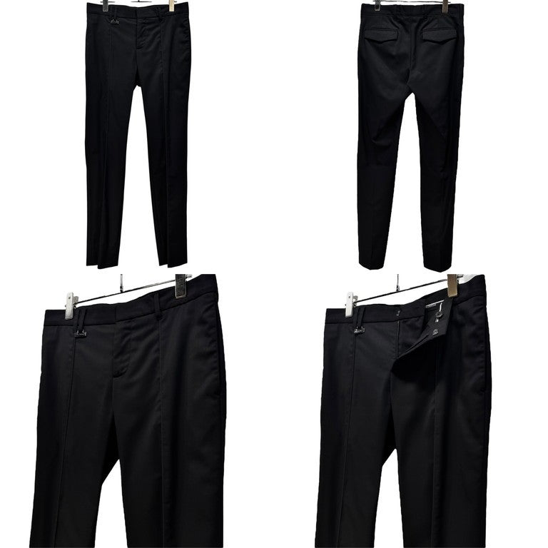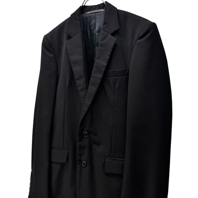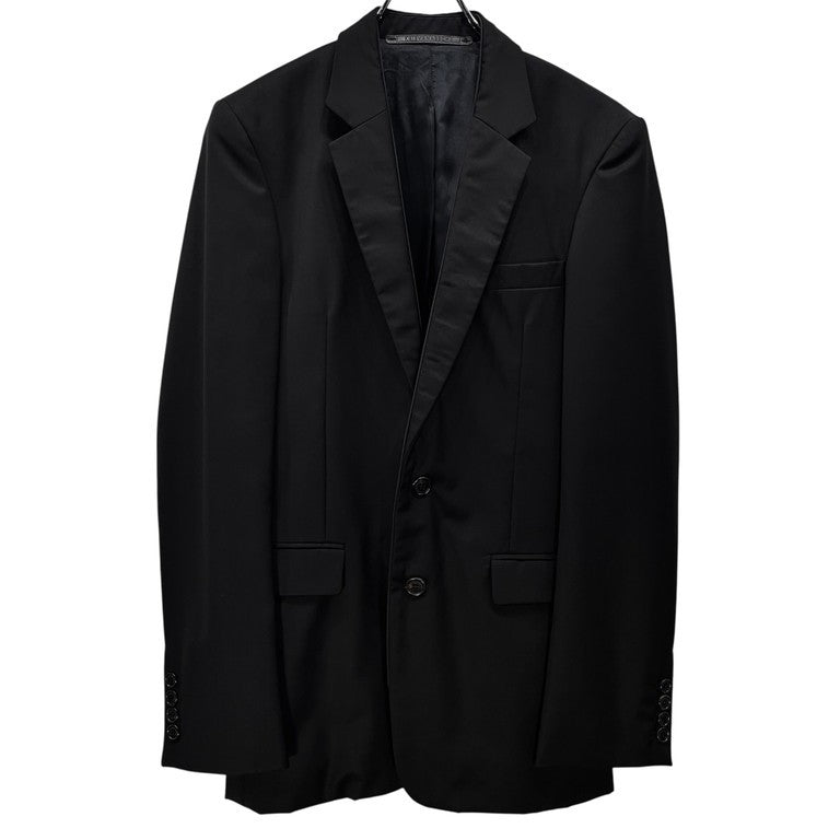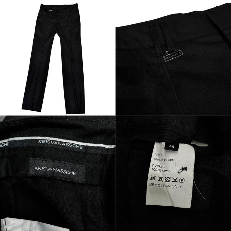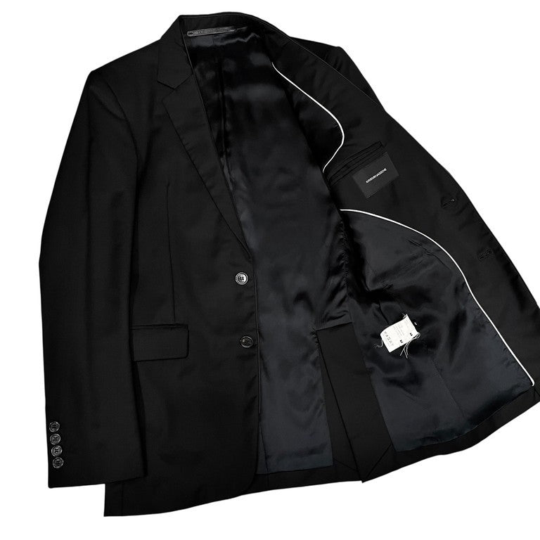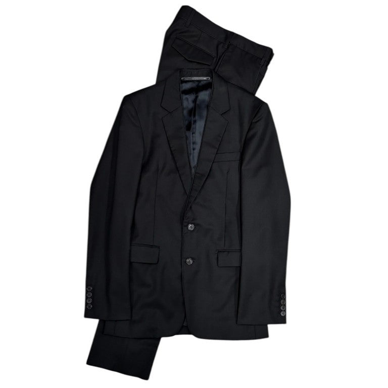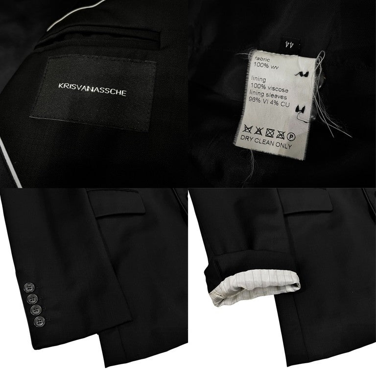 KRIS VAN ASSCHE 06AW ウールギャバジン2Bレイヤードライクスーツです。ネックラインや袖部分に別布が縫い合わされたレイヤード風のデティールが特徴となっております。パンツもジャケット同様の別布がタック部分に縫い合わせられたカジュアルな印象のスーツ。ジャケットは2B、レーヨン総裏地、袖裏ストライプ、サイドベンツ仕様となっております。エディスリマンによるDior Hommeの影響も感じられ、この時期のDior Hommeのスーツとかなり近いタイトフィッティングとなっております。若干の使用感はあるかと思いますが、目立った傷や汚れもなくまだまだお使いいただけます。