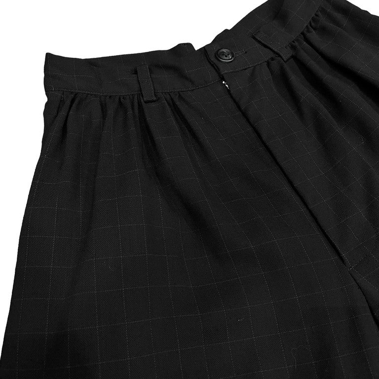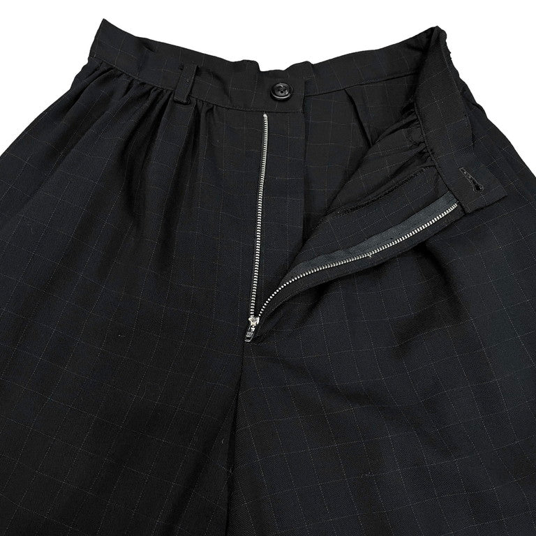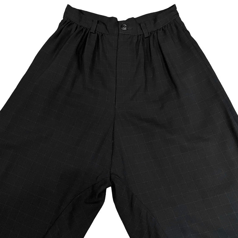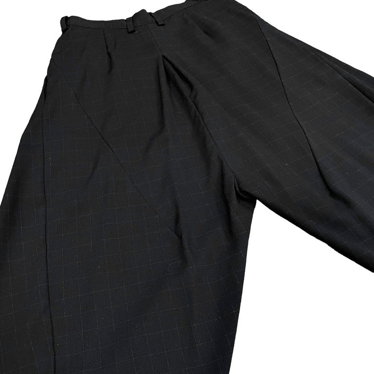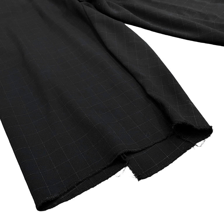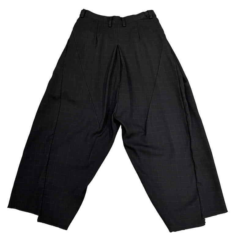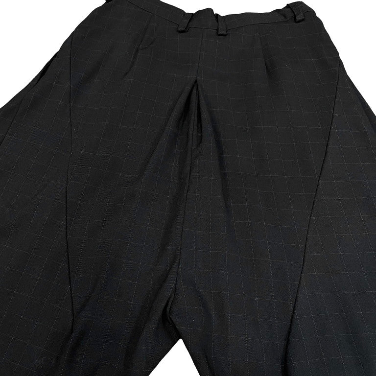 DseconD ウールウィンドウペンチェックカットオフテーパードパンツです。ウィンドウペンチェック柄のウール生地が使用されたテーパードパンツ。フロントはウエスト部分でギャザーを取りボリューミーに、腰部分から膝後ろにかけてはダーツが入っており、アナトミカルなパターンで製作されています。サイドシームを後ろ側へ倒していくような立体的な構造も特徴的。サイドシームから繋がった裾はアシンメトリーなカッティングで処理されています。サイズが合えば性別関係なくお使いいただけるアイテム。若干の使用感はあるかと思いますが、目立った傷や汚れもなくまだまだお使いいただけます。