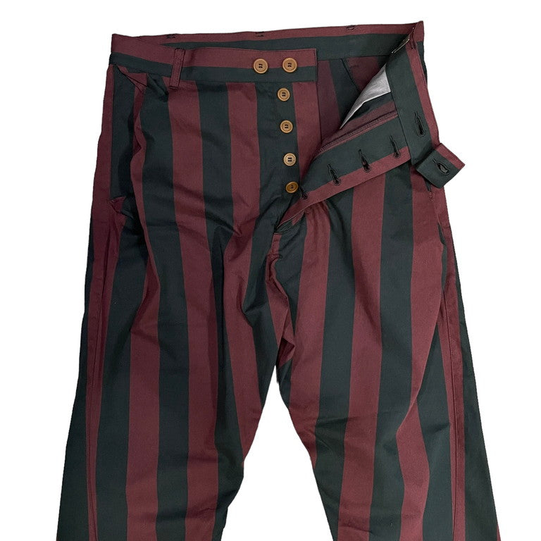 Vivienne Westwood MAN 22AW 立体裁断ストライプパンツです。コットン100%で構成されたこちらのアイテム。ボルドーレッドとブラックの落ち着いたカラーリングのストライプ生地となっており、随所に立体裁断が施されれているのが特徴的な1着。フロントスラッシュポケットから腿にかけてが盛り上がるようなパターンが取られており、タックのような役割も担っております。フロントフライパートは敢えてボタンフライが少し見える様な作りに。ヴィヴィアン特有のボタンカラーリングも特徴の1つ。腿部分から裾にかけて捻じれるようなシームで、着用時少し締まってみえる様なテーパードパターンとなっております。若干の使用感はあるかと思いますが、目立った傷や汚れもなくまだまだお使いいただけます。