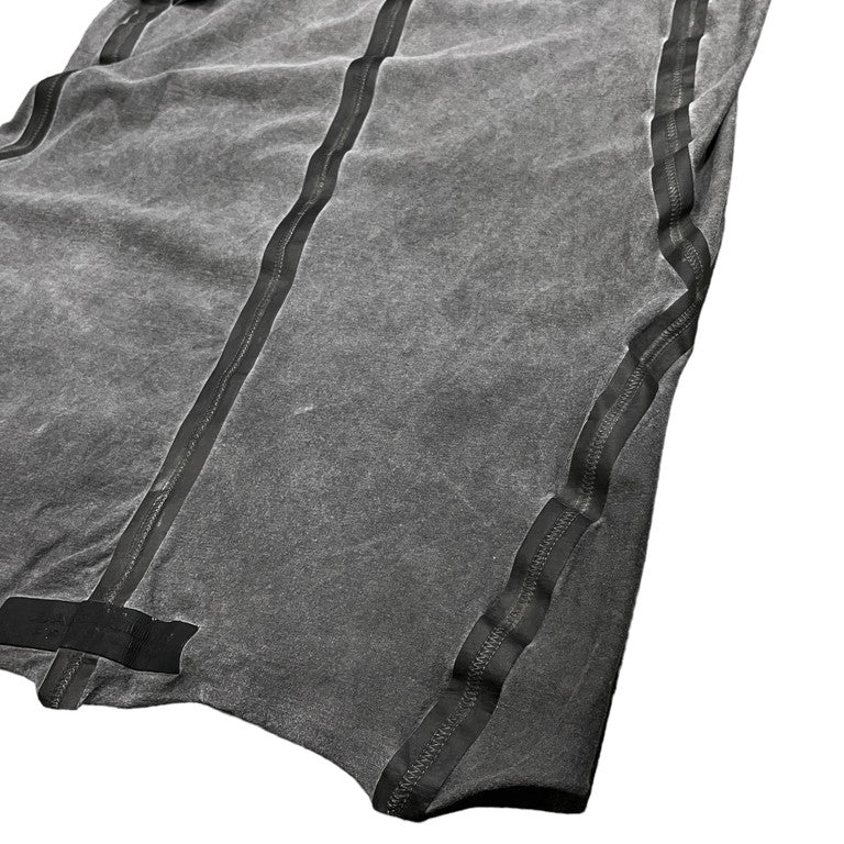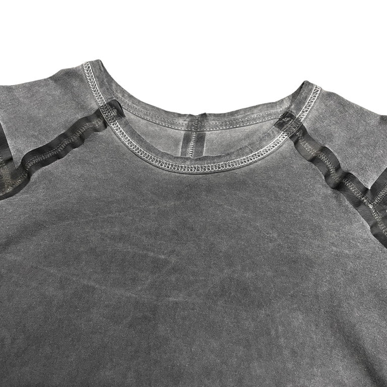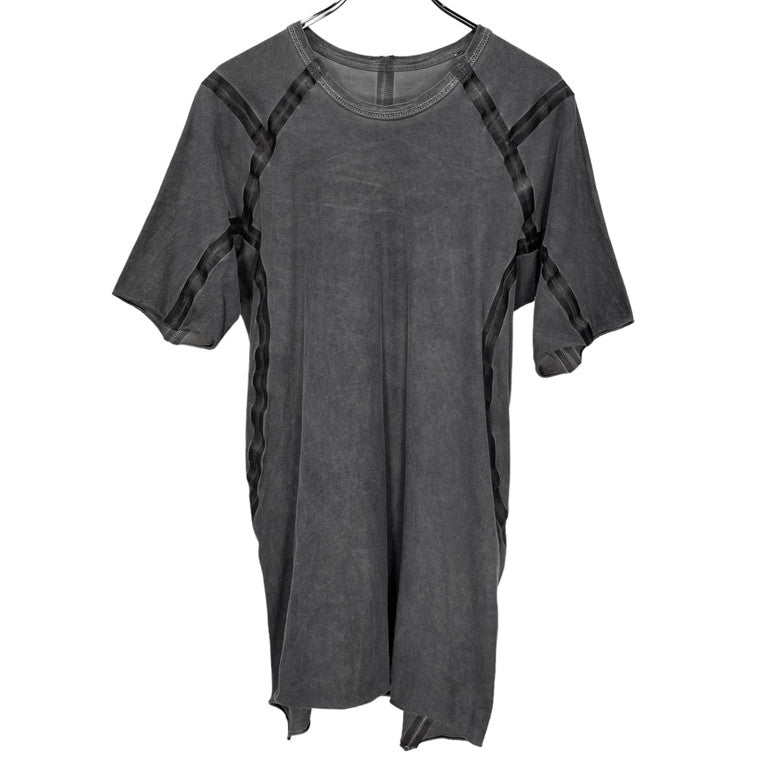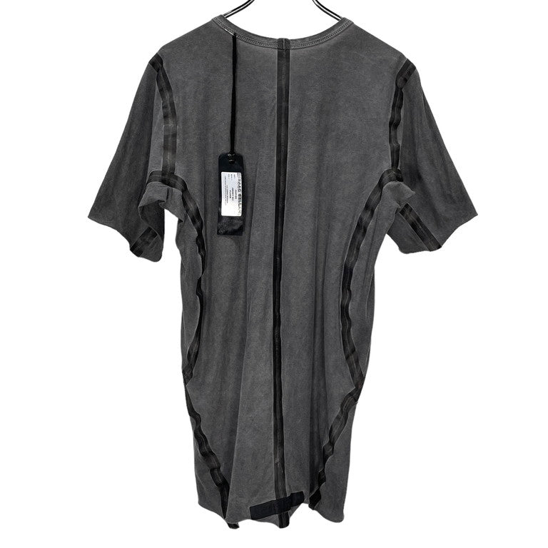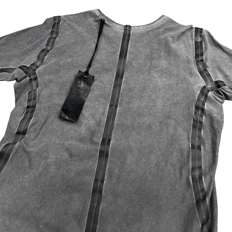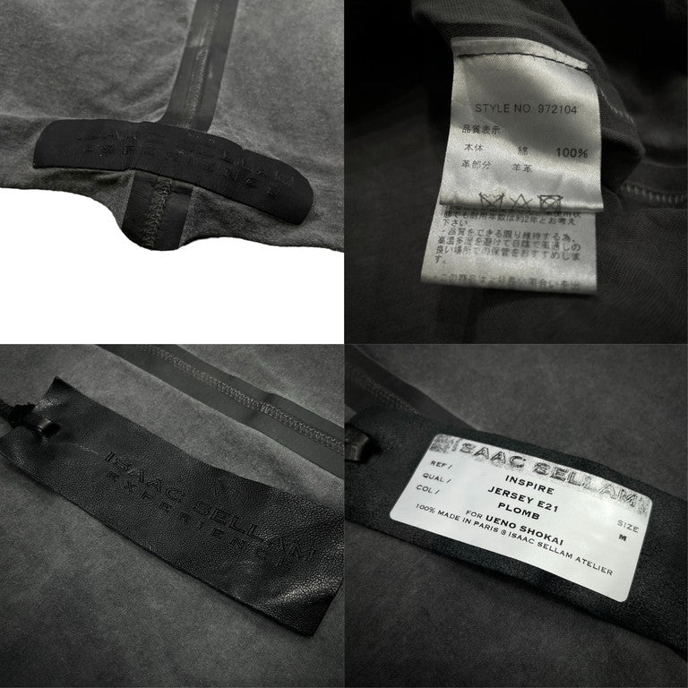 ISAAC SELLAM 21SS ラムレザーシームテーピングインサイドアウトクルーネックカットオフカットソーです。襟ぐり以外のシーム箇所にラムレザー素材のテーピングが施されたTシャツ。縫製が表裏逆になったインサイドアウトデザインの上からシームテープで仕上げられています。袖口や裾はカットオフ仕立て。独特の退廃的なカラーリングも相まってアイザックセラムならではの一着に仕上がっています。定価48,000円と高額なモデル。若干の使用感はあるかと思いますが、目立った傷や汚れもなくまだまだお使いいただけます。