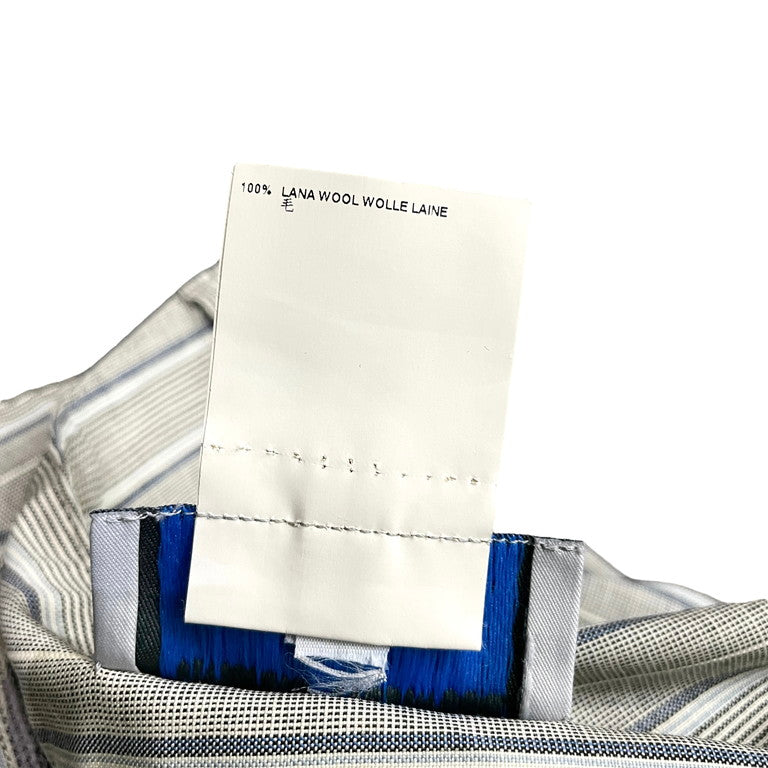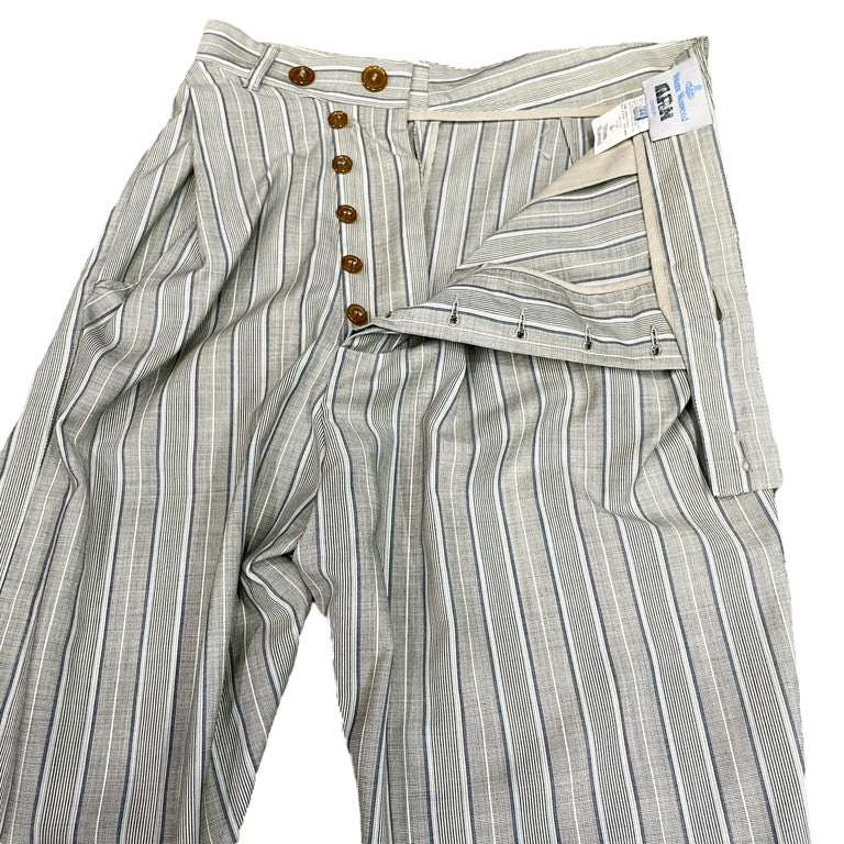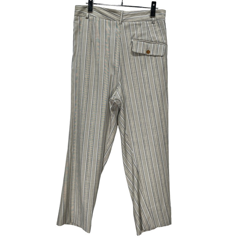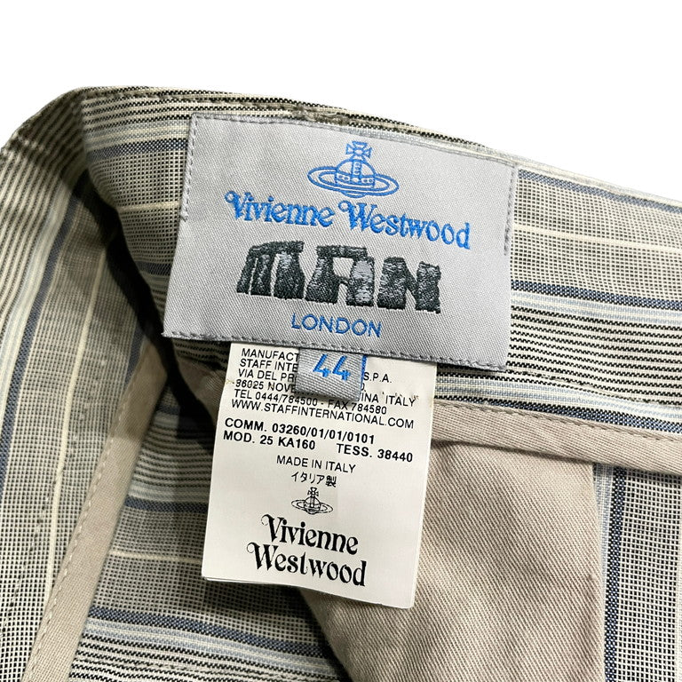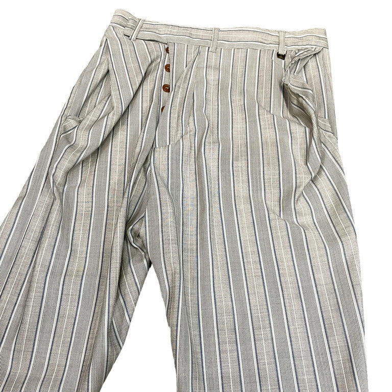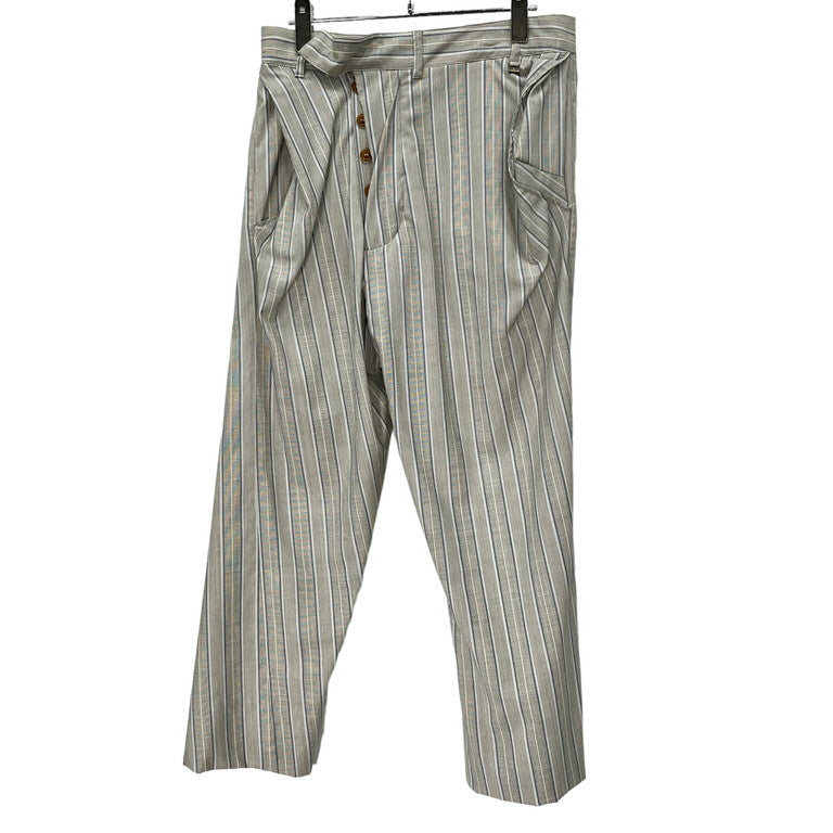 Vivienne Westwood MAN 10SS ストライプサマーウールアシンメトリースラックスパンツです。2010年春夏モデルのこちらのアイテム。グレー地にブルー、水色、白のストライプが入った少しヴィンテージライクな柄のサマーウール生地を使用しており、サラリとした涼しげな肌触りとなっております。ボタンフライ仕様となっており、ボタンが少し表側に見え、中心を少しずらしたアシンメトリーデザインとなっており、スラッシュポケットが膨らむような立体裁断を施したヴィヴィアンウエストウッドらしい脱構築的なシルエットが魅力的な1着となっております。若干の使用感はあるかと思いますが、目立った傷や汚れもなくまだまだお使いいただけます。