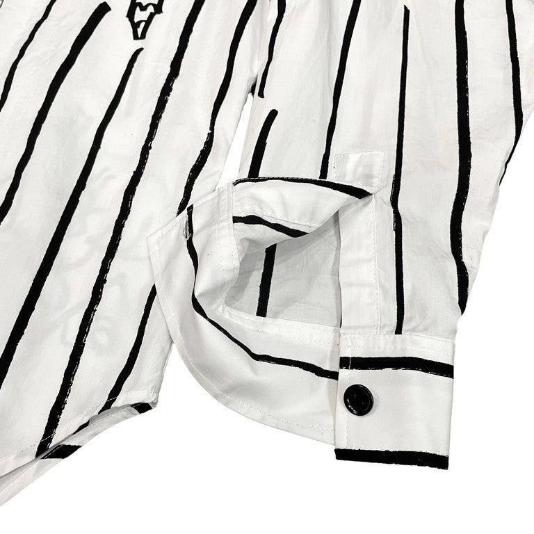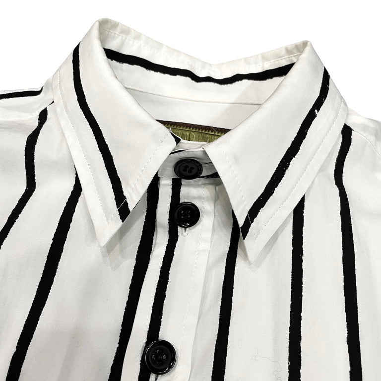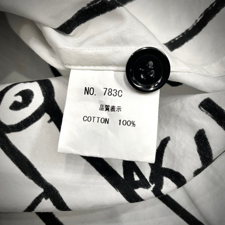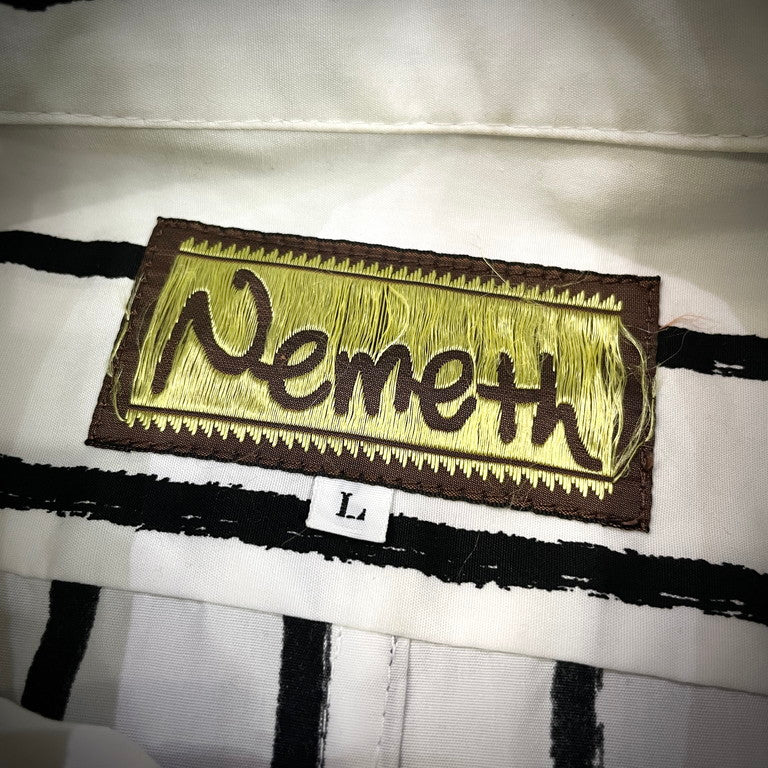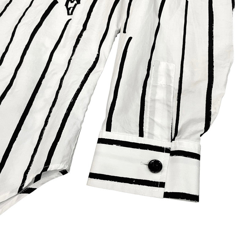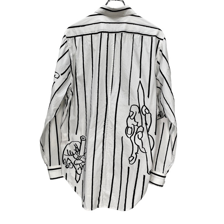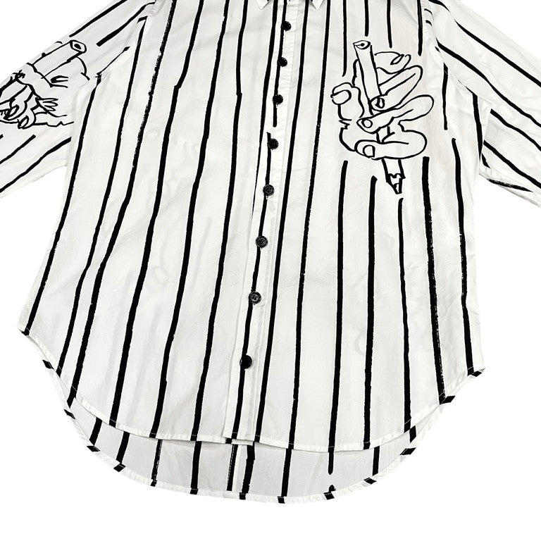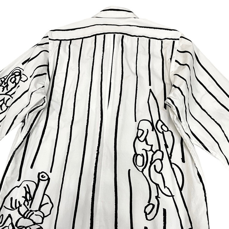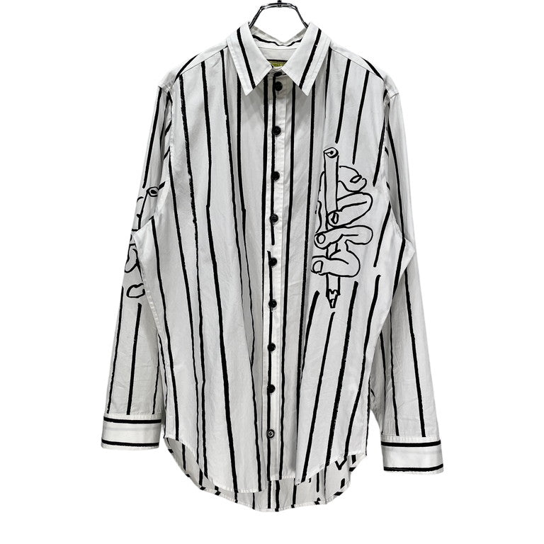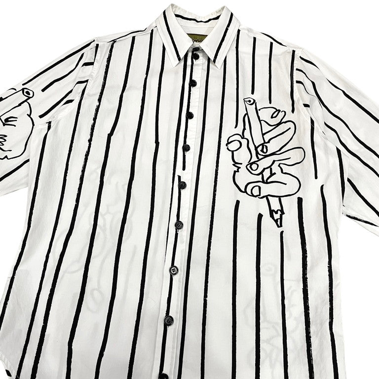 Christopher Nemeth コットンブロードアートプリントストライプシャツです。コットンブロード生地が使用されたレギュラーカラーシャツ。全体にあしらわれた手を模したアートやストライプ柄が特徴的です。アートプリント同様、ストライプ柄の箇所も手で線を描いたように、線の端に擦れた箇所があるのも特徴的。クリストファーネメスならではのプリントが魅力的な一着に仕上がっています。首周りに薄汚れがございますが、それ以外は目立った傷や汚れもなくまだまだお使いいただけます。
