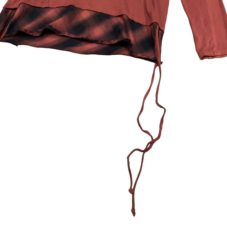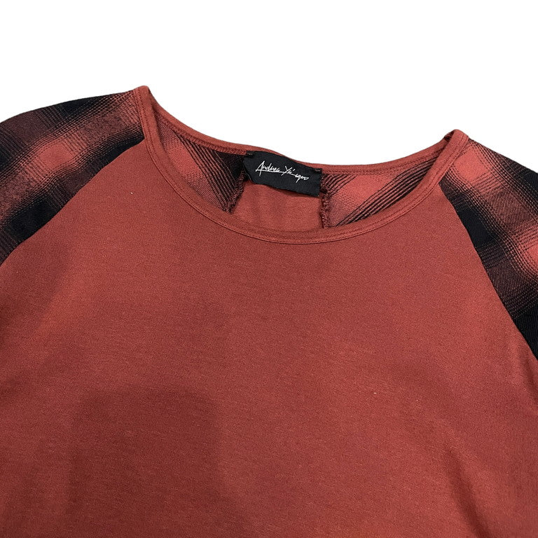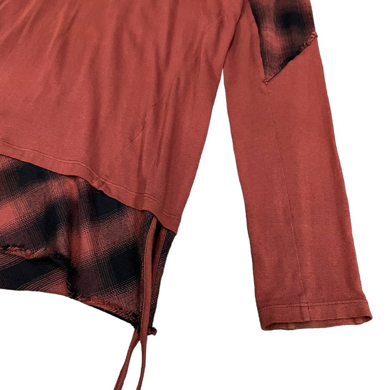 Andrea Ya'aqov チェックコットンフランネル切替カットオフレイヤードアナトミカルカットソーです。アナトミカルなパターンが引かれたTシャツ。パターンが引かれていることにより一般的なカットソーよりも着心地のよい仕上がりです。フロントや背面・袖口は天竺生地を使用。肩回りから裾にかけて、チェックシャツ等に使用されるフランネル生地で切り替えています。裾はレイヤードしているかのようなデザイン。裾の両サイドにはコードがあしらわれており、結んだり、ベルトループに固定したりと多様なスタイリングをお楽しみいただけます。一着ではもちろんのこと、シャツやジャケット等のインナーとしてもお使いいただきやすいアイテム。若干の使用感はあるかと思いますが、目立った傷や汚れもなくまだまだお使いいただけます。
