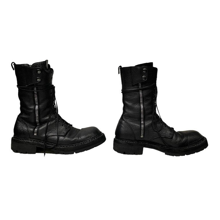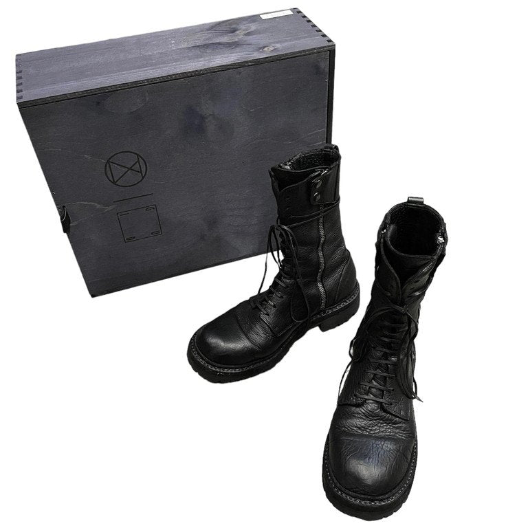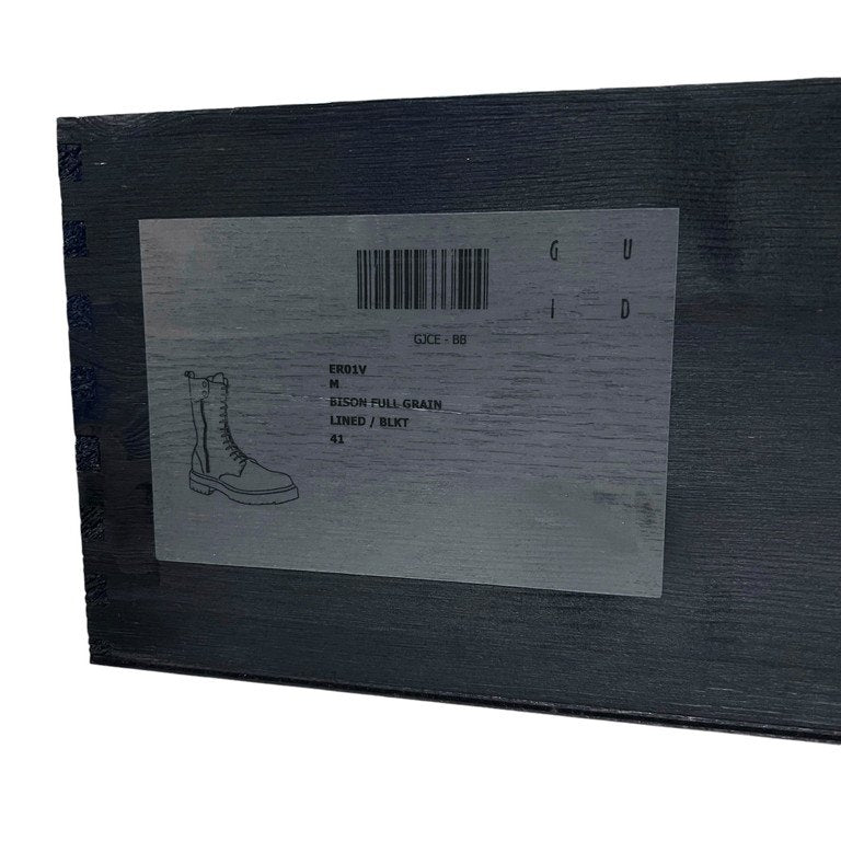 ニューヨークのメディア、StyleZeitgeistとのコラボレーションにより制作された世界150足限定のコンバットブーツ。GUIDI社の既成モデル GR05Vをベースに、オリジナルのディテールが追加され展開されたER01Vです。レザーにはシボ感のあるベジタブルタンニンバイソンレザーを採用。ソールにはVibram社製タンクソールが採用されています。定価269,500円と高額なモデル。使用感の少ない美品です。こちらのモデルをデザインしたEugene Rabkin氏が手掛けた木製のシューズボックス・トートバッグ・タグ類が付属いたします。