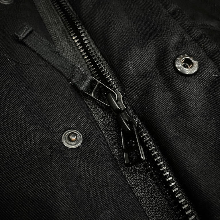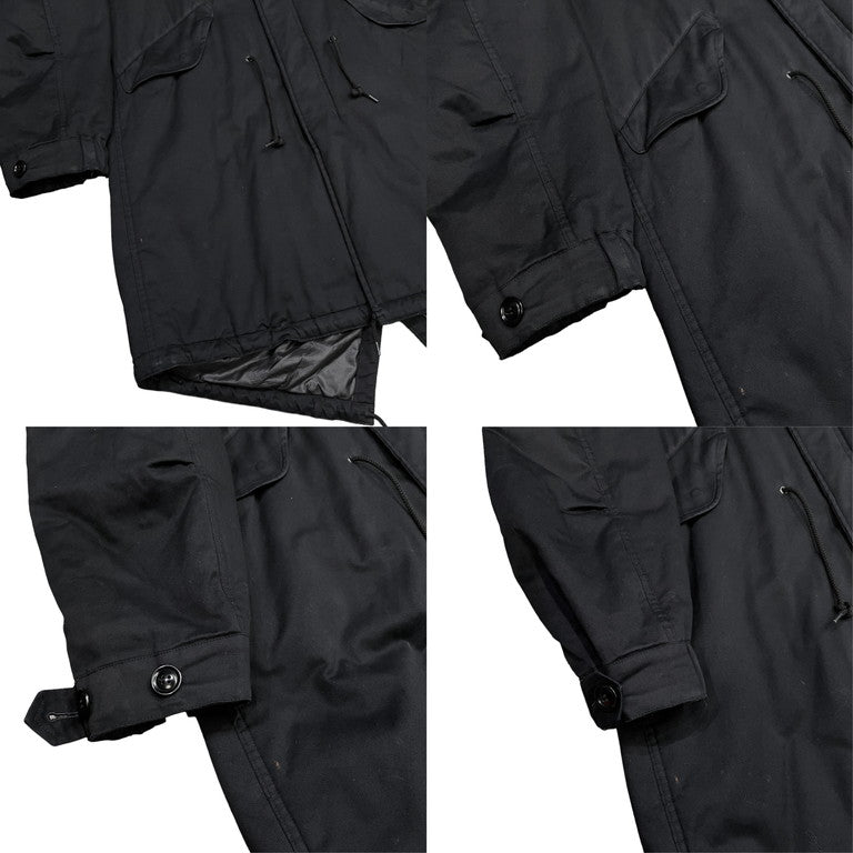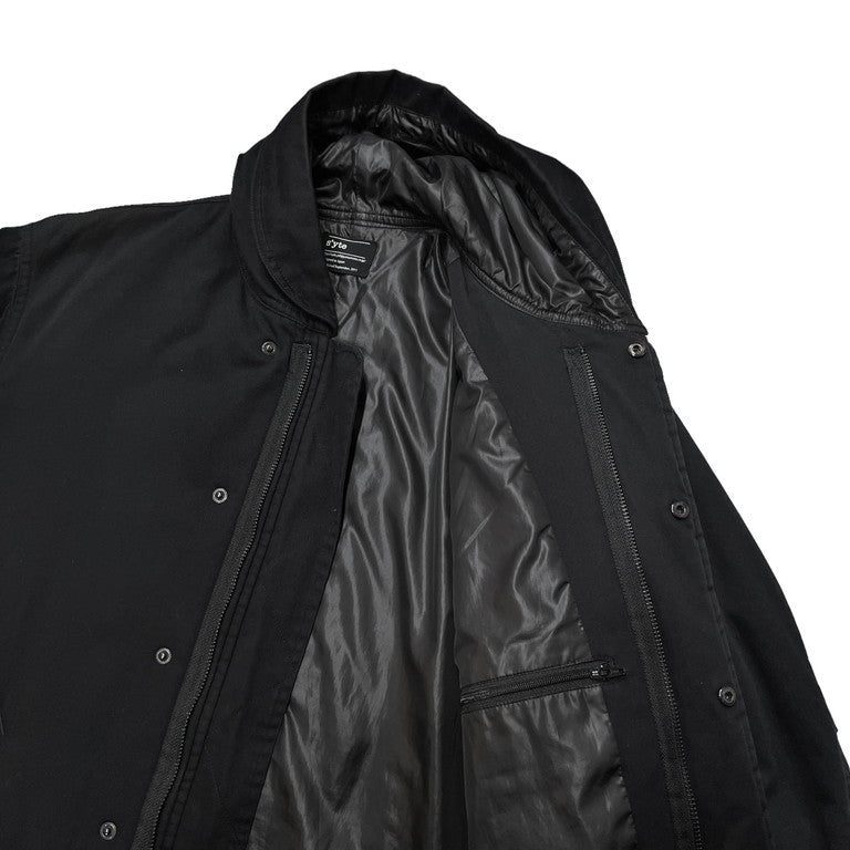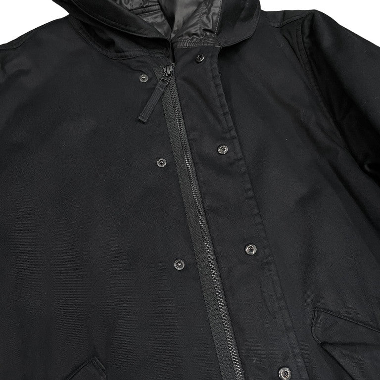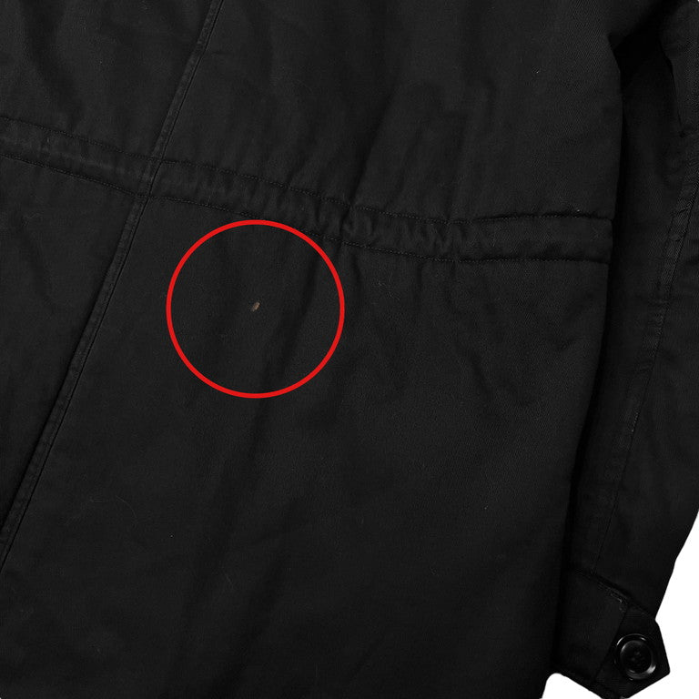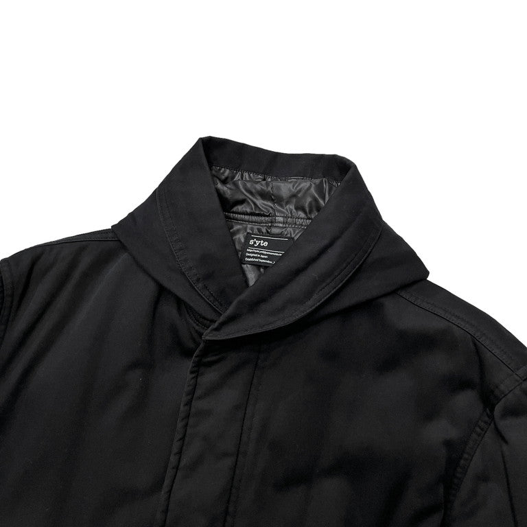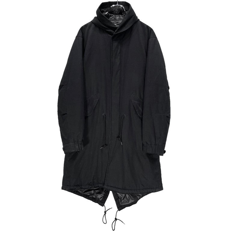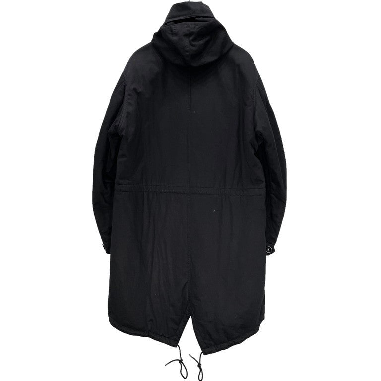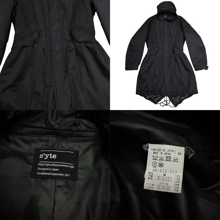 S'YTE Yohji Yamamoto 18AW Cotton Twill Padded Mods Coat コットンツイルフーデッド中綿モッズコートです。コットンツイル生地が使用されたモッズコート。中綿があしらわれており真冬でも着用が可能です。フロントダブルジップ仕立て。フードや腰・裾にはフィッティングを調節可能なドローストリングが配備され、袖口も2段階でフィッティングの調節が可能。身頃両サイドにはスナップボタン開閉式のフラップポケットが、内側には左身頃にのみジップ開閉式の収納ポケットが、右身頃の裾付近には隠しジップポケットが配備されています。機能的なディテールでありながら、ヨウジヤマモトならではのシルエットをお楽しみいただける一着。サイズが合えば性別関係なくお使いいただけるアイテムです。フード部分のドローストリングが欠損しており、背面腰付近に色移りのような箇所がございます。それ以外は大きく目立った傷や汚れもなくまだまだお使いいただけます。